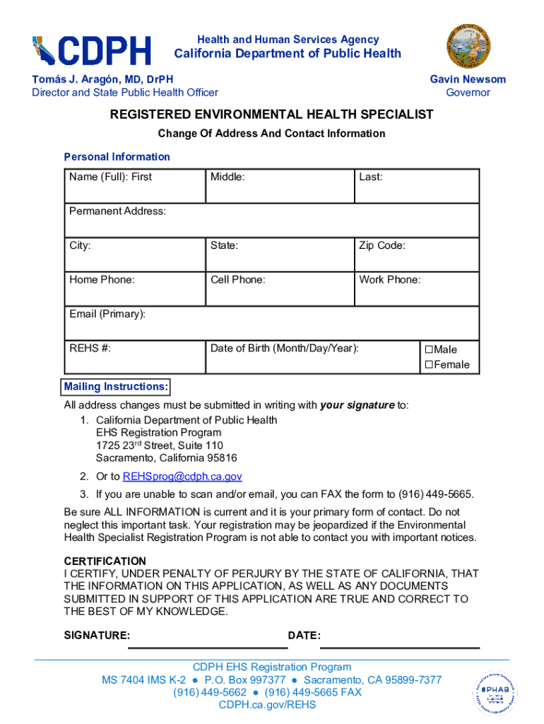 This form is used by Registered Environmental Health Specialists in California to update their personal address and contact information with the California Department of Public Health. It includes sections for personal details, mailing instructions for submitting changes, and a certification statement.