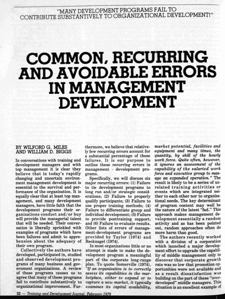 \"MANY DEVELOPMENT PROGRAMS FAIL TO CONTRIBUTE SUBSTANTIVELY TO ORGANIZATIONAL DEVELOPMENT!\"COMMON, RECURRING AND AVOIDABLE ERRORS IN MANAGEMENT DEVELOPMENT BY WILFORD G. MILES AND WILLIAM D. BIGGS