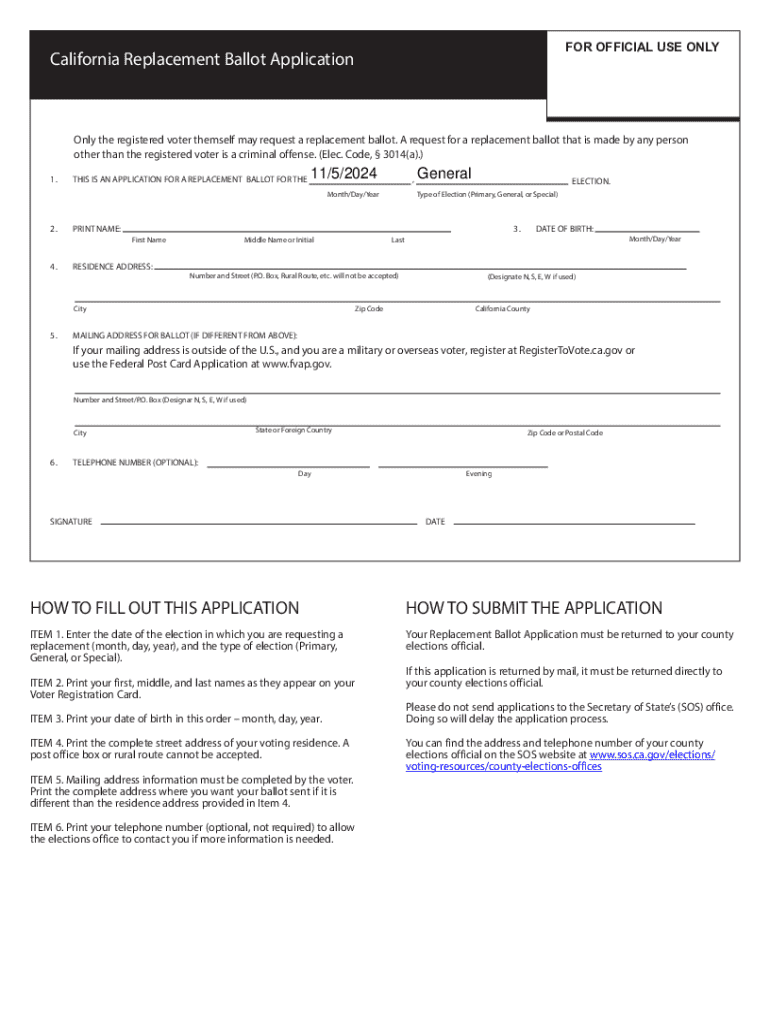 FOR OFFICIAL USE ONLYCalifornia Replacement Ballot ApplicationOnly the registered voter themself may request a replacement ballot. A request for a replacement ballot that is made by any person other