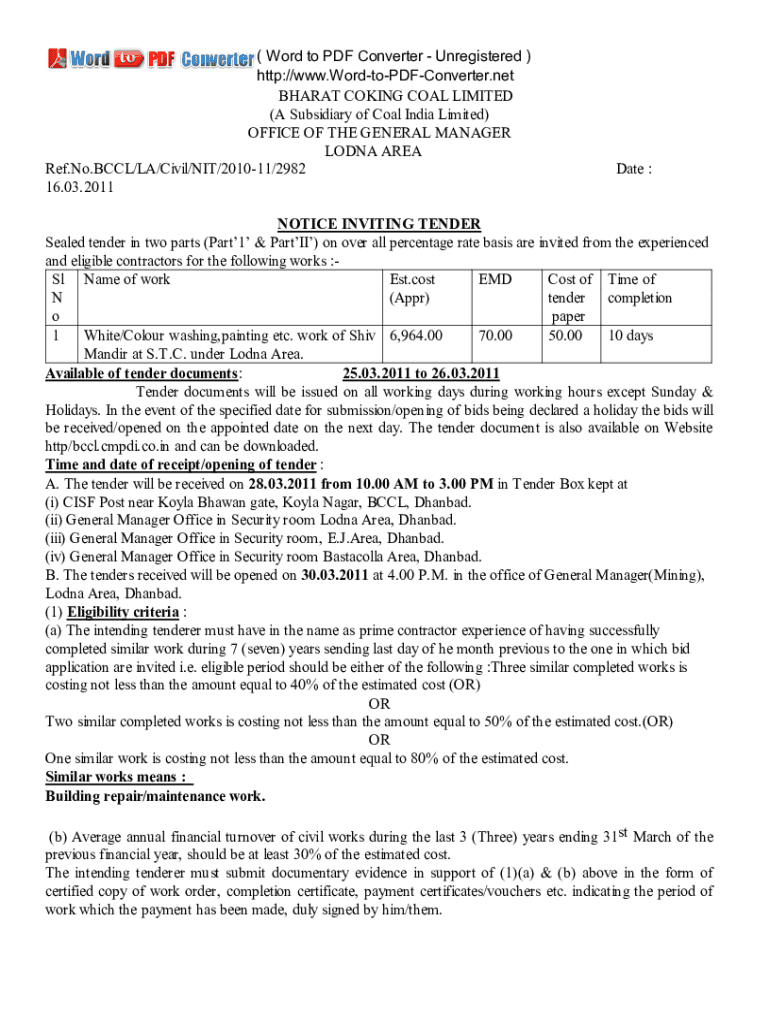 ( Word to PDF Converter Unregistered ) http://www.WordtoPDFConverter.net BHARAT COKING COAL LIMITED (A Subsidiary of Coal India Limited) OFFICE OF THE GENERAL MANAGER LODNA AREA Ref.No.BCCL/LA/Civil/NIT/201011/2982