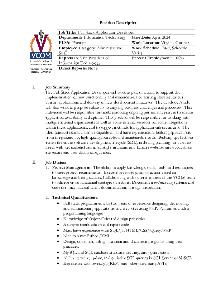 This document outlines the responsibilities, qualifications, and expectations for the Full Stack Application Developer role at VCOM. The developer will be responsible for both enhancing existing applications and creating new functionality, ensuring application performance and security, and collaborating with various internal departments and external vendors. The position requires a strong technical background in multiple programming languages and application development processes.