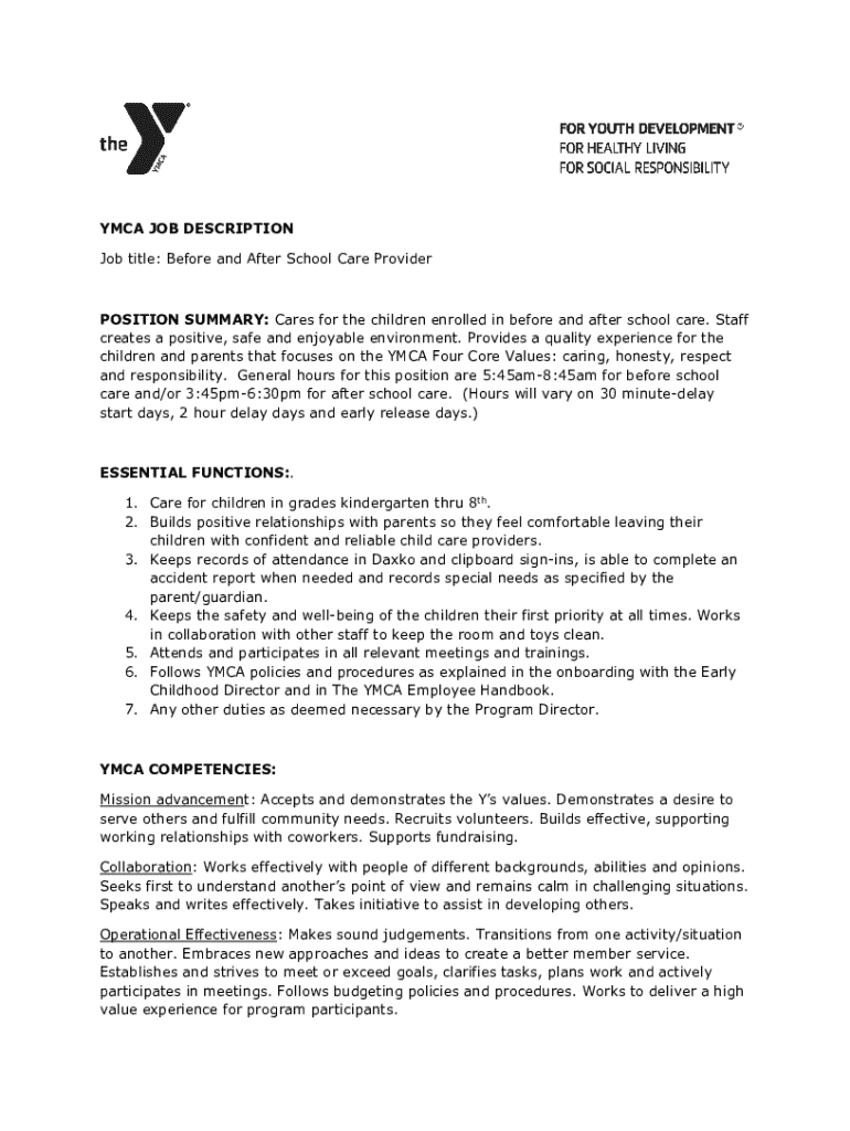 This document outlines the job responsibilities and qualifications for a Before and After School Care Provider at the YMCA. It emphasizes the importance of caring for children, building relationships with parents, maintaining safety, and following YMCA policies. The position requires specific certifications and physical abilities to ensure a safe and engaging environment for children.