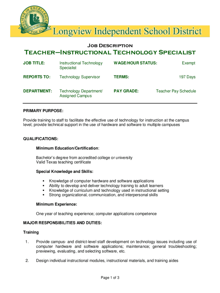 This document outlines the job description for the position of Teacher–Instructional Technology Specialist. It includes the primary purpose, qualifications, major responsibilities and duties related to training, technical support, budget and inventory management, supervisory responsibilities, equipment used, working conditions, and evaluation methods.