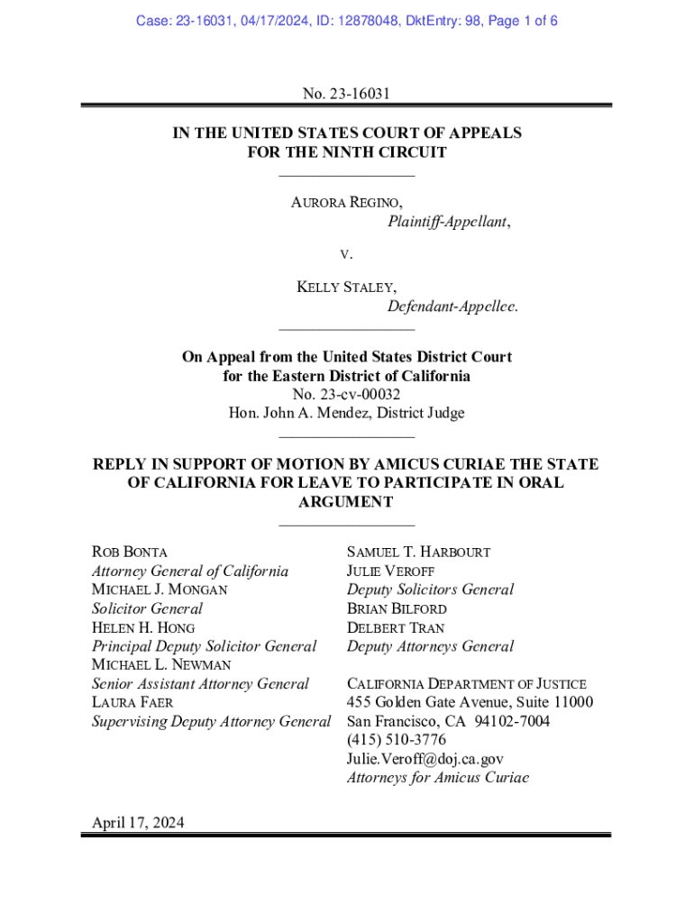 Case: 2316031, 04/17/2024, ID: 12878048, DktEntry: 98, Page 1 of 6No. 2316031 IN THE UNITED STATES COURT OF APPEALS FOR THE NINTH CIRCUIT ___AURORA REGINO, PlaintiffAppellant, V.KELLY STALEY, DefendantAppellee.___On