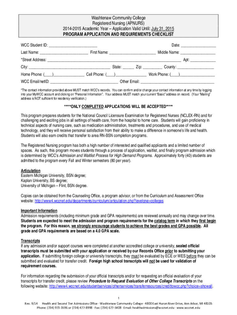This document outlines the application process, requirements, and essential information for prospective students applying to the Registered Nursing program at Washtenaw Community College for the 2014-2015 academic year. It includes details about admission criteria, prerequisite courses, important deadlines, and contact information for financial aid and program coordinators.
