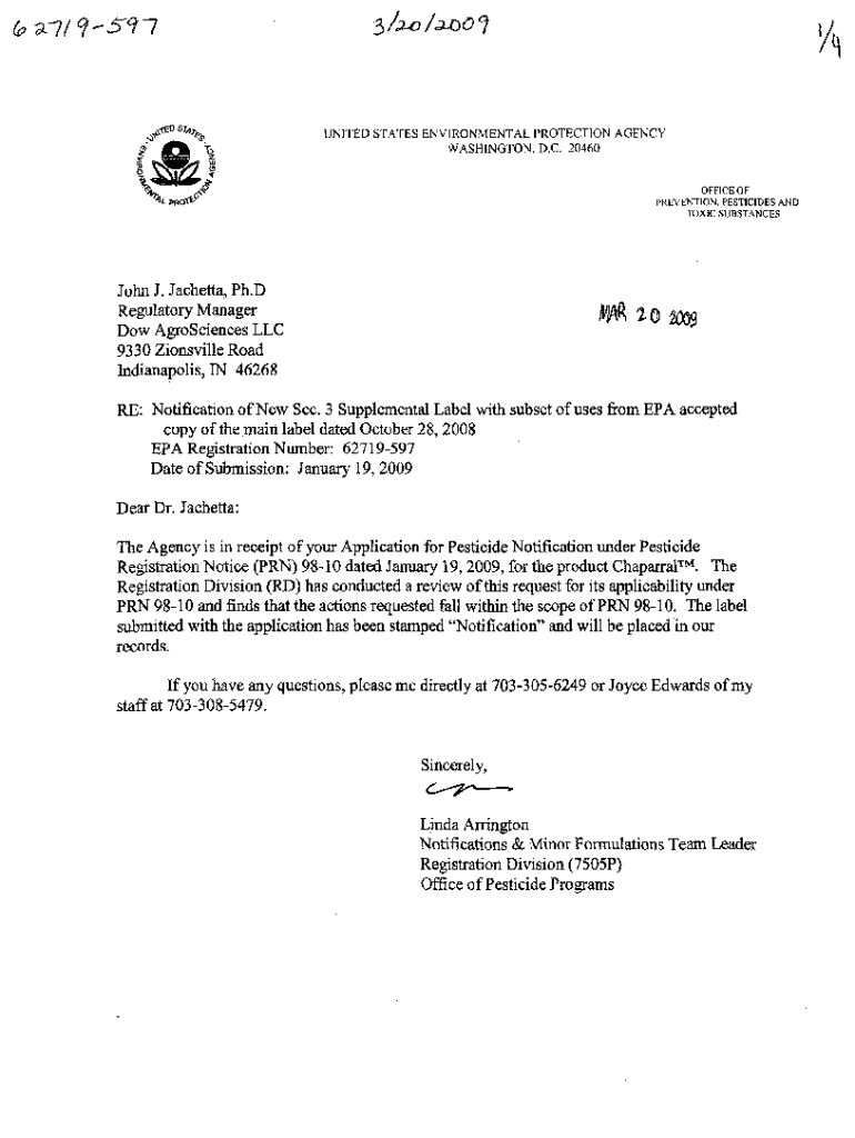 h ;;\'11 Cf597UNITED STATES ENVIRONMENTAL PROTECTION AGENCY WASHINGTON. D.C. 20460OFFICE OF PREVENTION. PESTICIDES AND TOXIC SUBSTANCESJohn J. Jachetta, Ph.D Regulatory Manager Dow AgroSciences LLC