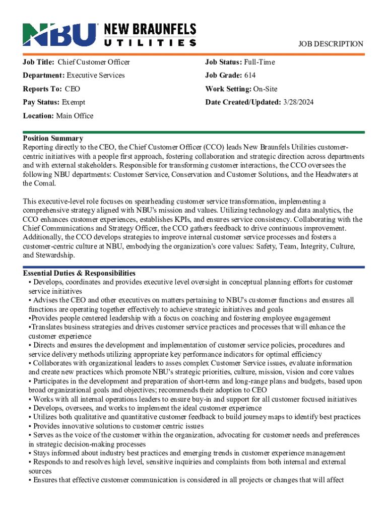 JOB DESCRIPTION Job Title: Chief Customer OfficerJob Status: FullTimeDepartment: Executive ServicesJob Grade: 614Reports To: CEOWork Setting: OnSitePay Status: ExemptDate Created/Updated: 3/28/2024Location: