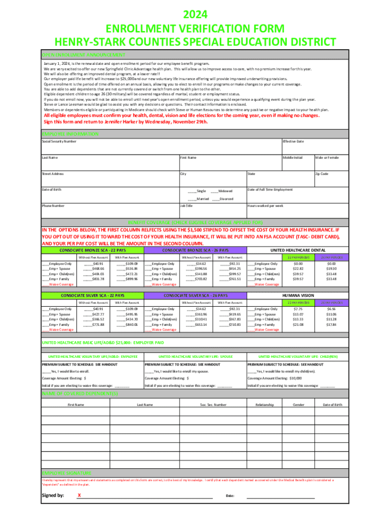 This document serves as an enrollment verification for the employee benefit programs of the Henry-Stark Counties Special Education District for the year 2024. It outlines important benefit updates, eligibility criteria, and instructions for enrollment in health, dental, vision, and life insurance plans. The document details the open enrollment period, key contacts for assistance, and the importance of confirming coverage selections for the upcoming year.