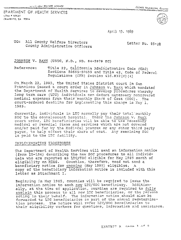 STATE OF CALFORINA AND WELFARE AGENCYGEORGE DEUKMEJIAN, GovernorDEPARTMENT Or HEALTH SERVICES/ 744 P STREET 714 SACRAMENTOCA95814April 15, 1985TO:All County Welfare Directors County Administrative