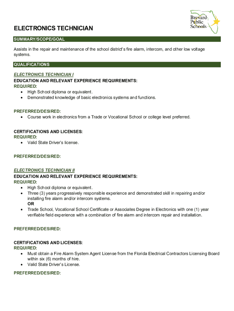 This document outlines the qualifications, responsibilities, and performance expectations for the Electronics Technician position within a school district. It details the different levels of the technician role, from entry-level to advanced, focusing on the repair and maintenance of fire alarm, intercom, and other low voltage systems.