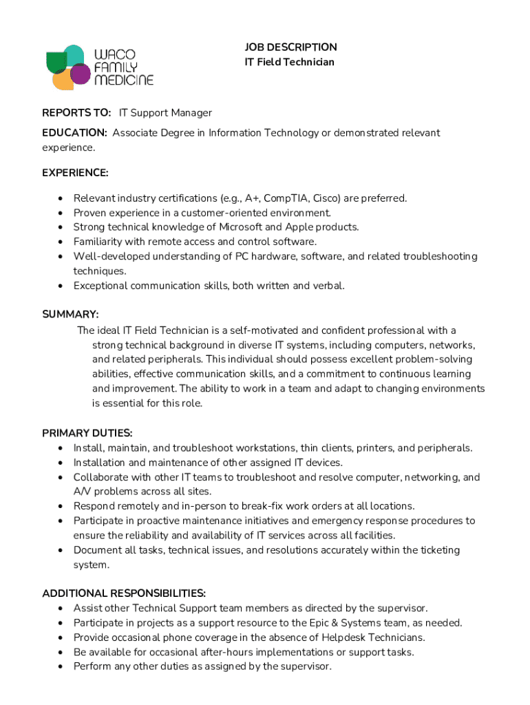JOB DESCRIPTION IT Field TechnicianREPORTS TO: IT Support Manager EDUCATION: Associate Degree in Information Technology or demonstrated relevant experience. EXPERIENCE: Relevant industry certifications