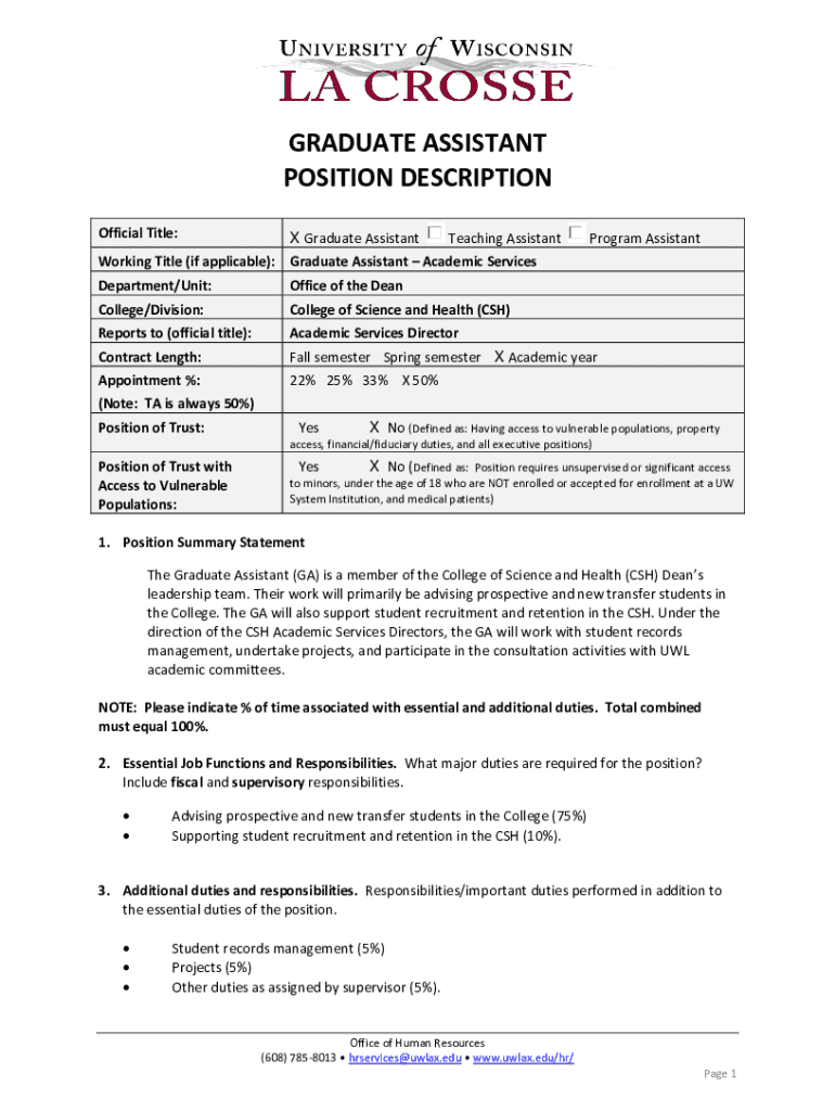 Graduate Assistant Position Description is not the form you're looking for?Search for another form here.