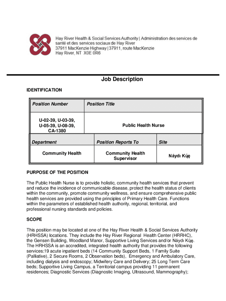 Job Description IDENTIFICATION Position NumberPosition TitleU0239, U0339, U0539, U0839, CA1380 Department Community HealthPublic Health NursePosition Reports To Community Health SupervisorSite Nyd