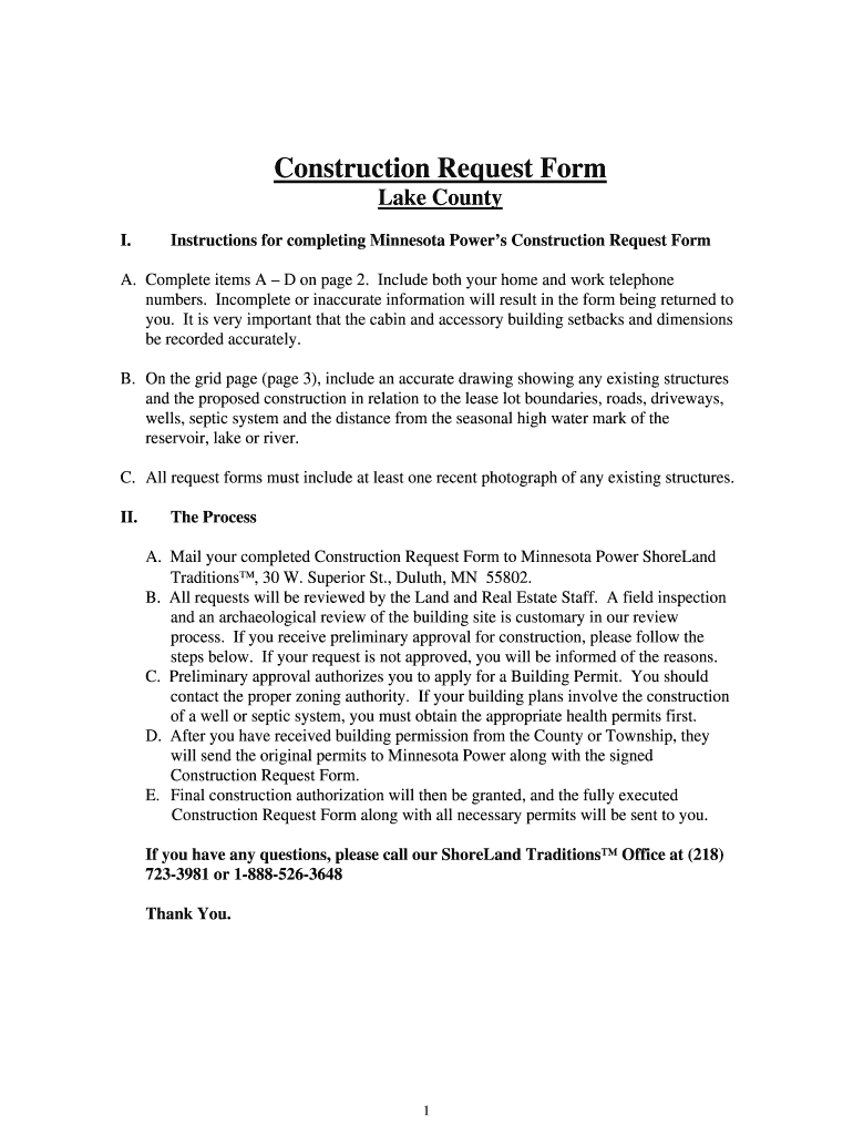 Construction Request Form Lake County I. Instructions for completing Minnesota Power s Construction Request Form A. Complete items A D on page 2. Include both your home and work telephone numbers.