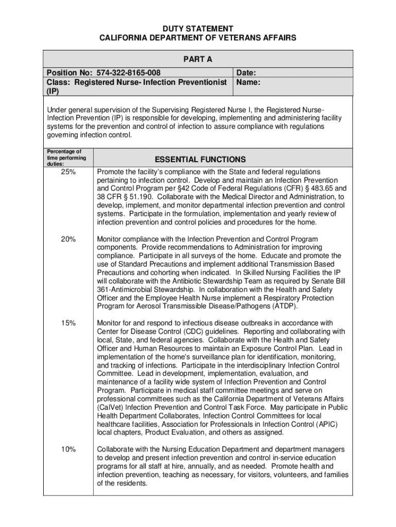 This document outlines the essential functions and requirements for the Registered Nurse - Infection Preventionist position at the California Department of Veterans Affairs. It details responsibilities related to infection control, compliance with regulations, collaboration with medical and administrative teams, education for staff, and management of outbreak responses.