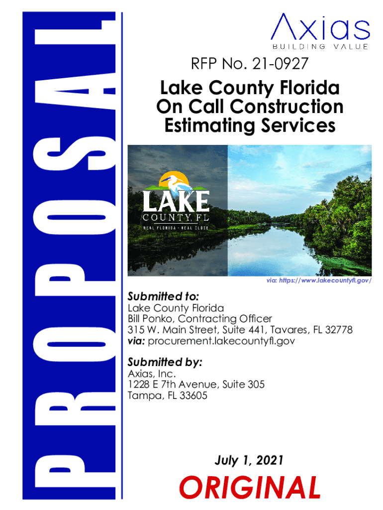 This document presents a proposal submitted by Axias, Inc. to Lake County, Florida for providing On Call Construction Estimating Services, detailing the firm\'s experience, project understanding, proposed solutions, and pricing structure in response to RFP No. 21-0927.