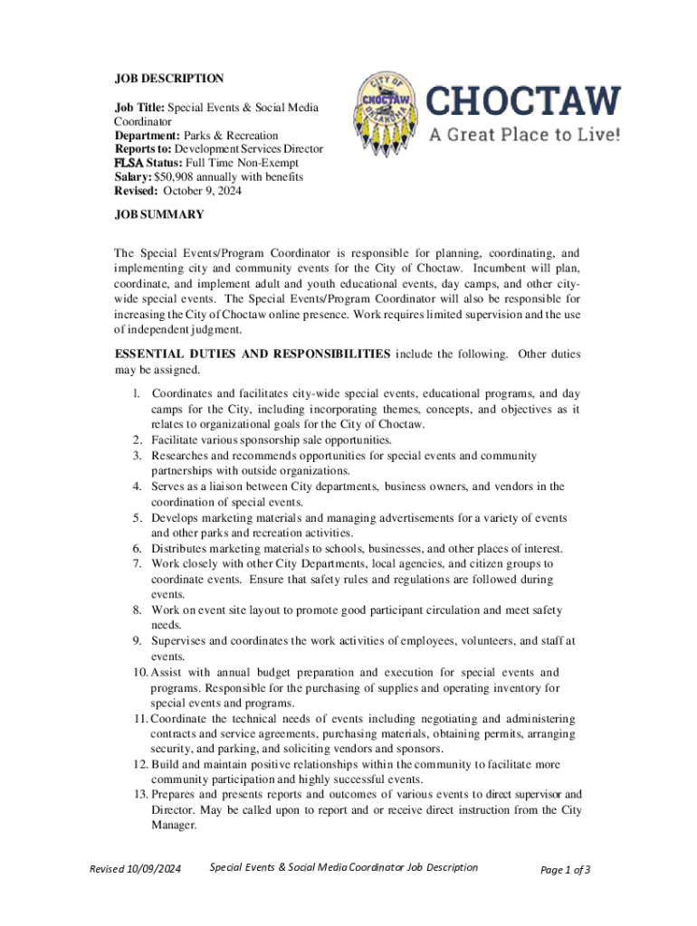 This job description outlines the responsibilities and qualifications for the Special Events & Social Media Coordinator position at the City of Choctaw. The role involves planning and implementing community events, managing social media content, and coordinating with various stakeholders to enhance community participation and online presence.