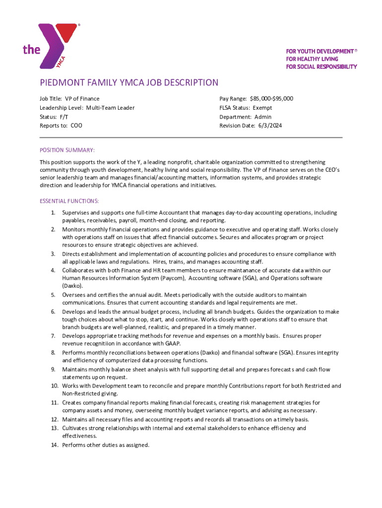 This document outlines the job description for the VP of Finance at Piedmont Family YMCA, detailing responsibilities, qualifications, and the work environment. The VP of Finance is a key member of the senior leadership team, responsible for managing financial operations, compliance, and budget processes in support of the organization\'s mission.