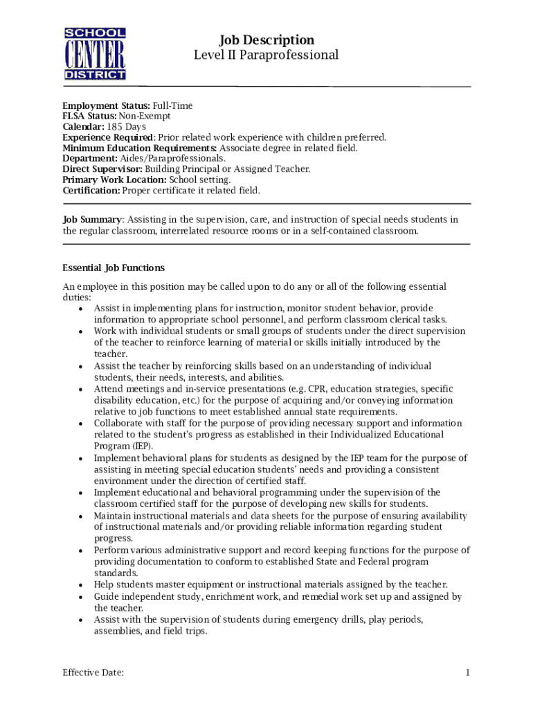 Job Description Level II ParaprofessionalEmployment Status: FullTime FLSA Status: NonExempt Calendar: 185 Days Experience Required: Prior related work experience with children preferred. Minimum Education