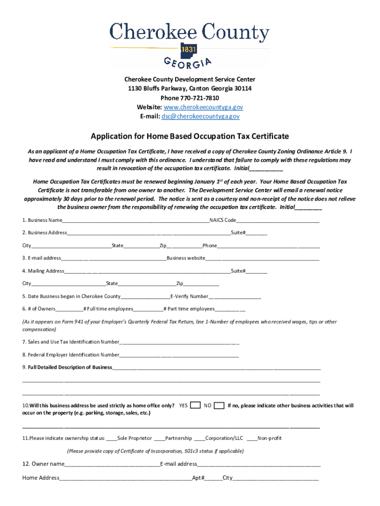 Cherokee County Development Service Center 1130 Bluffs Parkway, Canton Georgia 30114 Phone 7707217810 Website: www.cherokeecountyga.gov Email: dsc@cherokeecountyga.govApplication for Home Based Occupation