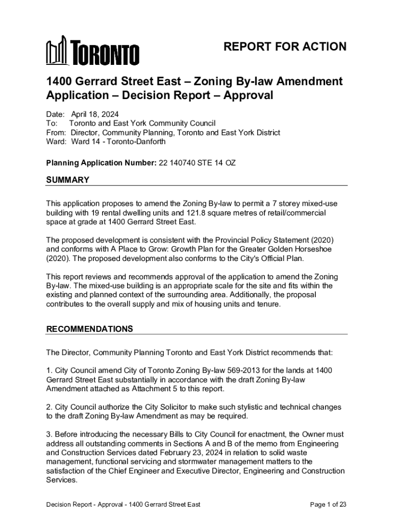 This document is a decision report regarding the zoning by-law amendment application for the proposed construction of a 7-story mixed-use building at 1400 Gerrard Street East. The development will include 19 rental dwelling units and 121.8 square meters of retail/commercial space, consistent with provincial and city planning policies. The report discusses community consultation, zoning amendments, and various planning requirements.