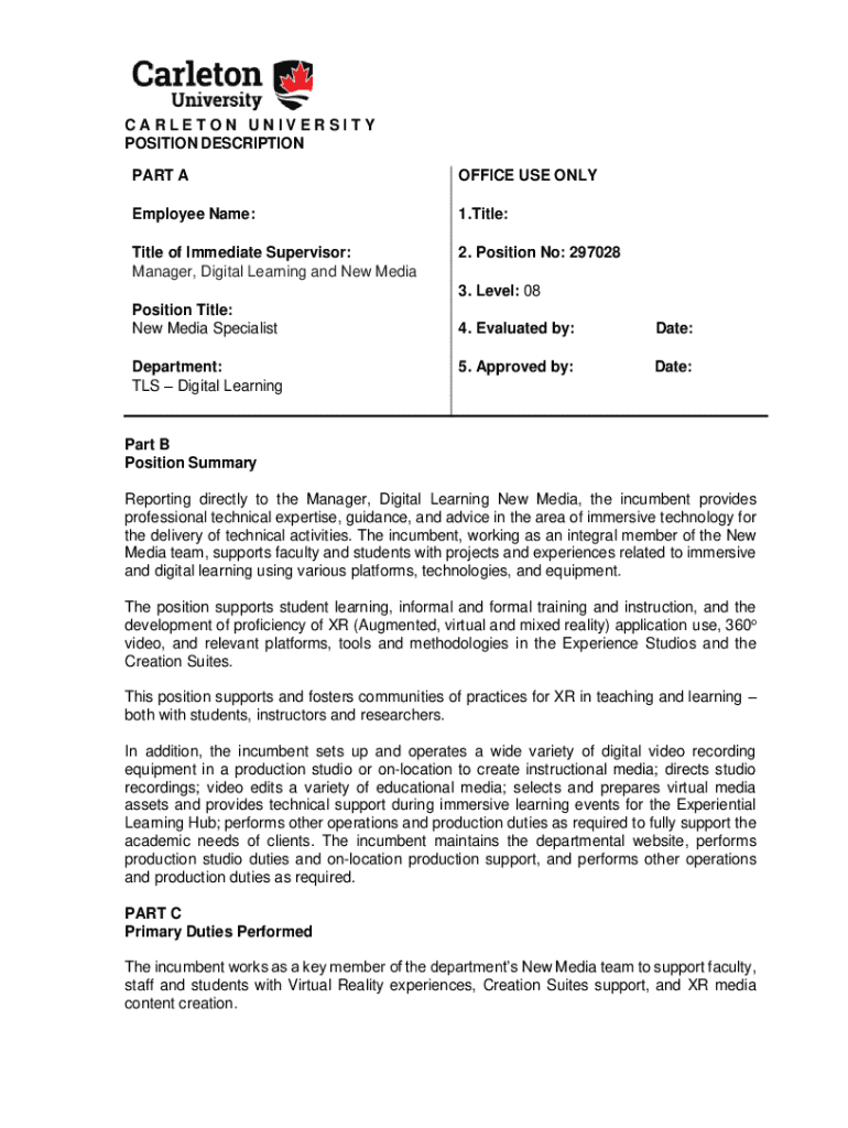 CARLETON UNIVERSITY POSITION DESCRIPTION PART AOFFICE USE ONLYEmployee Name:1.Title:Title of Immediate Supervisor: Manager, Digital Learning and New Media2. Position No: 297028 3. Level: 08Position