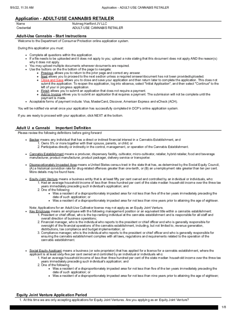 8/5/22, 11:35 AMApplication ADULTUSE CANNABIS RETAILERApplication ADULTUSE CANNABIS RETAILER Name CredentialNutmeg Hartford JV LLC ADULTUSE CANNABIS RETAILERAdultUse Cannabis Start Instructions Welcome