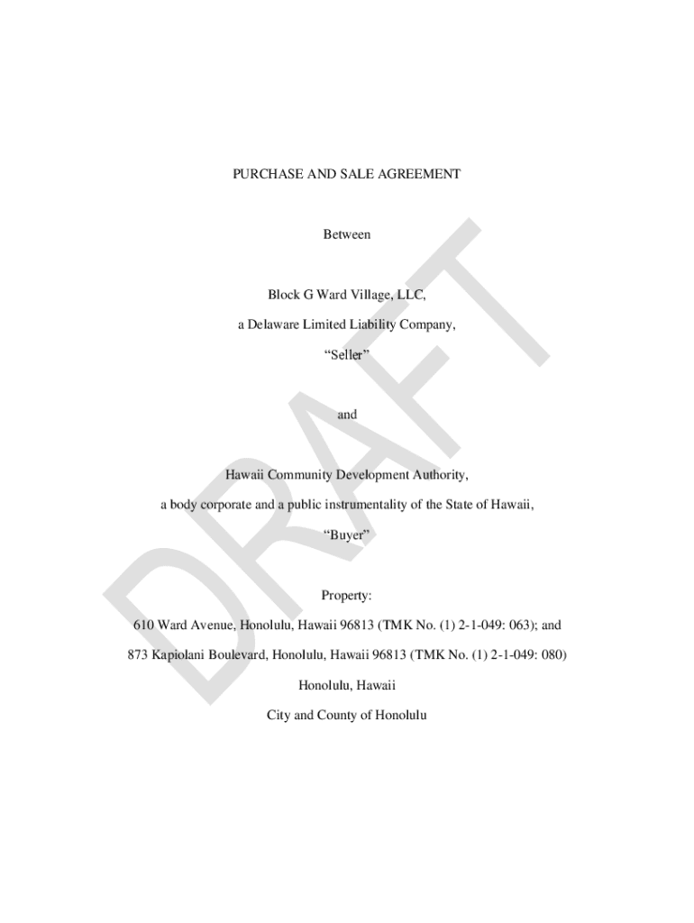 This document outlines the Purchase and Sale Agreement between Block G Ward Village, LLC (Seller) and Hawaii Community Development Authority (Buyer) for the sale of properties located at 610 Ward Avenue and 873 Kapiolani Boulevard in Honolulu, Hawaii. It details the terms and conditions of the sale, including the purchase price, due diligence process, and various obligations of both parties.