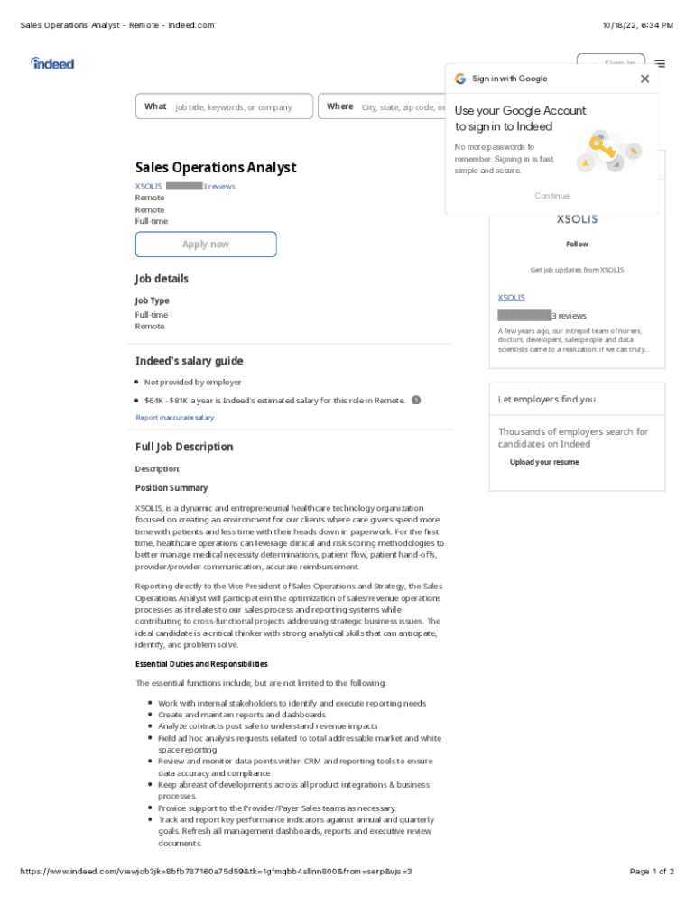 Sales Operations Analyst Remote Indeed.com10/18/22, 6:34 PMSign in Sign in with Google WhatJob title, keywords, or companyWhereSales Operations Analyst XSOLIS Remote Remote FulltimeFind Jobs Use your