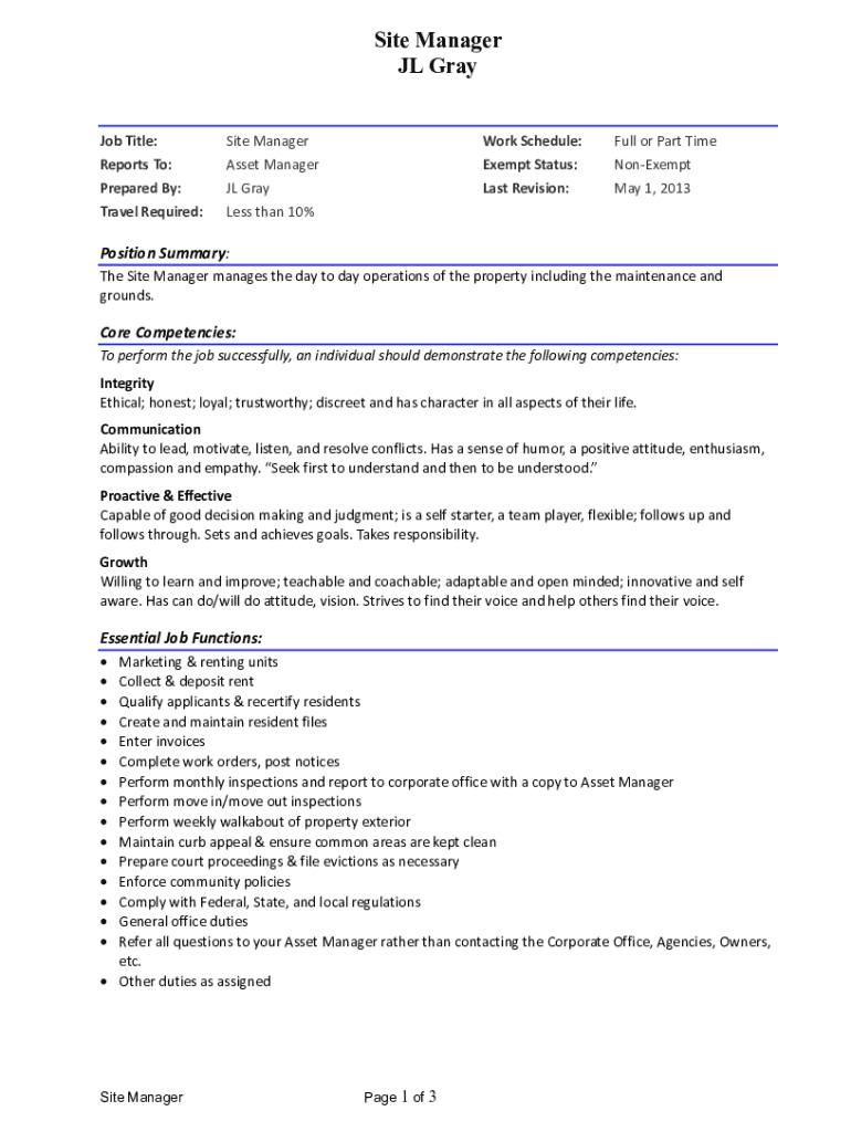 This document outlines the job description for the Site Manager position, detailing the responsibilities, qualifications, core competencies, and essential functions involved in managing the day-to-day operations of a property, including maintenance, tenant relations, marketing, and compliance with regulations.
