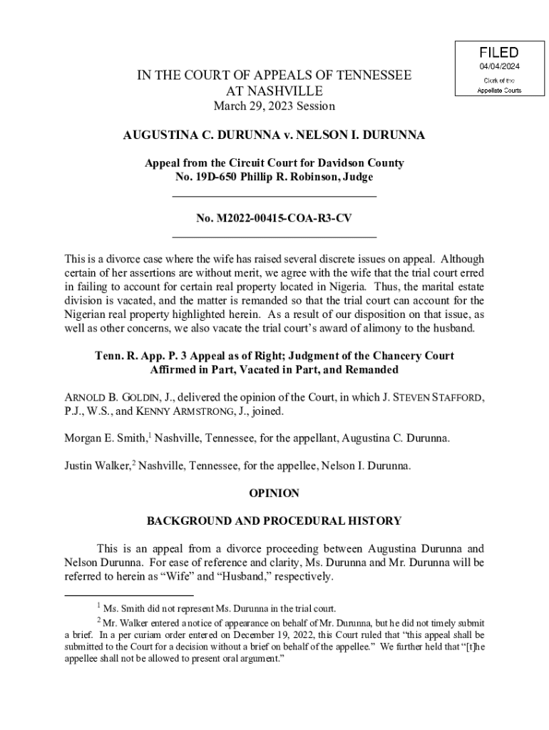 IN THE COURT OF APPEALS OF TENNESSEE AT NASHVILLE04/04/2024March 29, 2023 Session AUGUSTINA C. DURUNNA v. NELSON I. DURUNNA Appeal from the Circuit Court for Davidson County No. 19D650 Phillip R.
