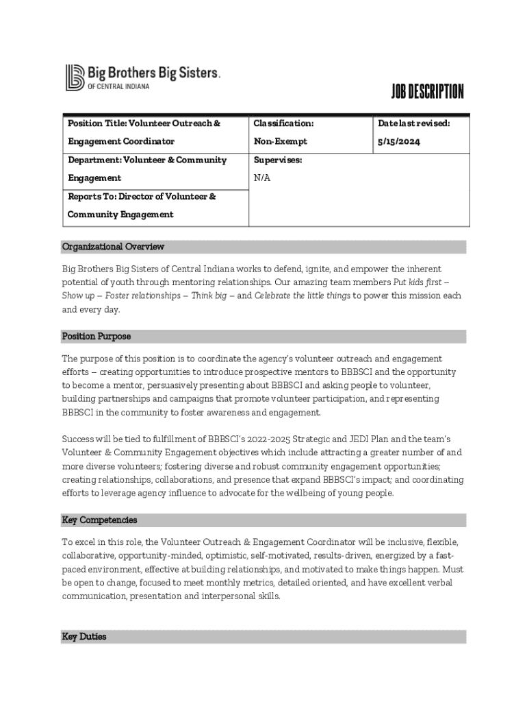This job description outlines the responsibilities, qualifications, and competencies required for the Volunteer Outreach & Engagement Coordinator position at Big Brothers Big Sisters of Central Indiana. The role focuses on coordinating volunteer outreach and engagement efforts, building partnerships, and representing the agency within the community to promote awareness and participation in mentoring programs.