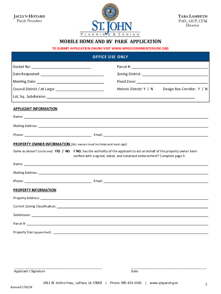 JACLYN HOTARDTARA LAMBETHParish PresidentPHD, AICP, CFM DirectorMOBILE HOME AND RV PARK APPLICATION TO SUBMIT APPLICATION ONLINE VISIT WWW.MYGOVERNMENTONLINE.ORGOFFICE USE ONLY Docket No:Parcel #:Date