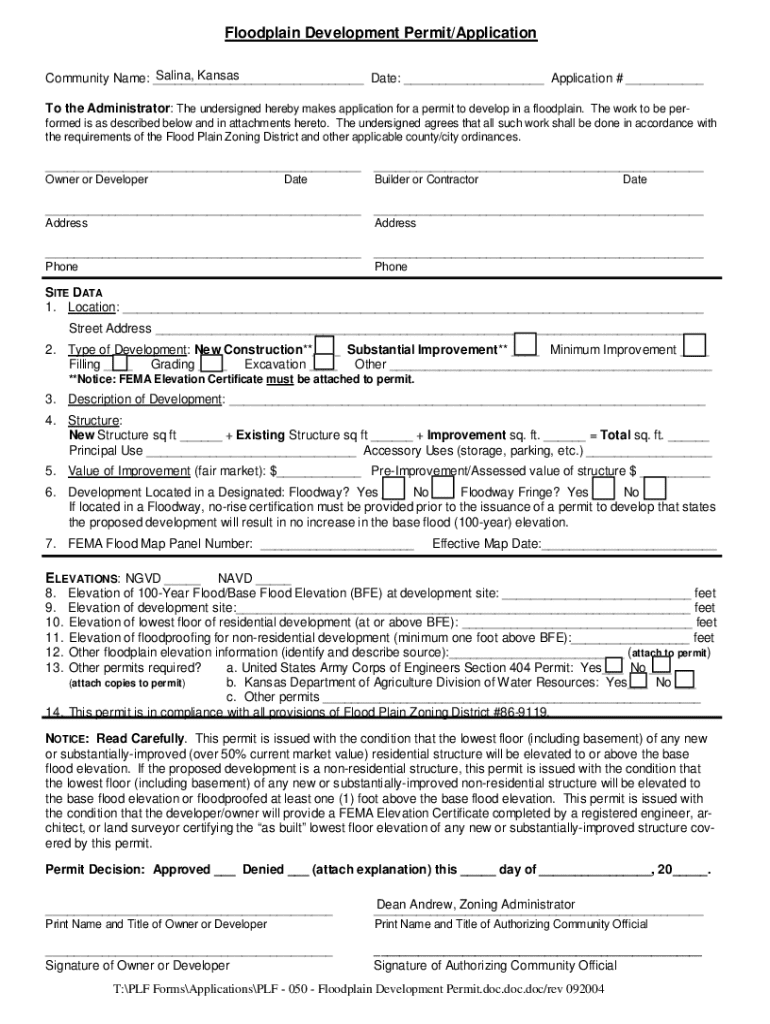 Floodplain Development Permit/Application Salina, Kansas Community Name: ___ Date: ___ Application # ___To the Administrator: The undersigned hereby makes application for a permit to develop in a