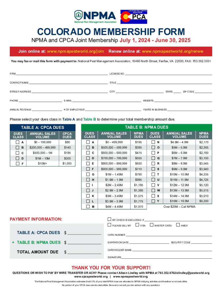 COLORADO MEMBERSHIP FORMNPMA and CPCA Joint Membership July 1, 2024 June 30, 2025 Join online at: www.npmapestworld.org/joinRenew online at: www.npmapestworld.org/renewYou may fax or mail this form