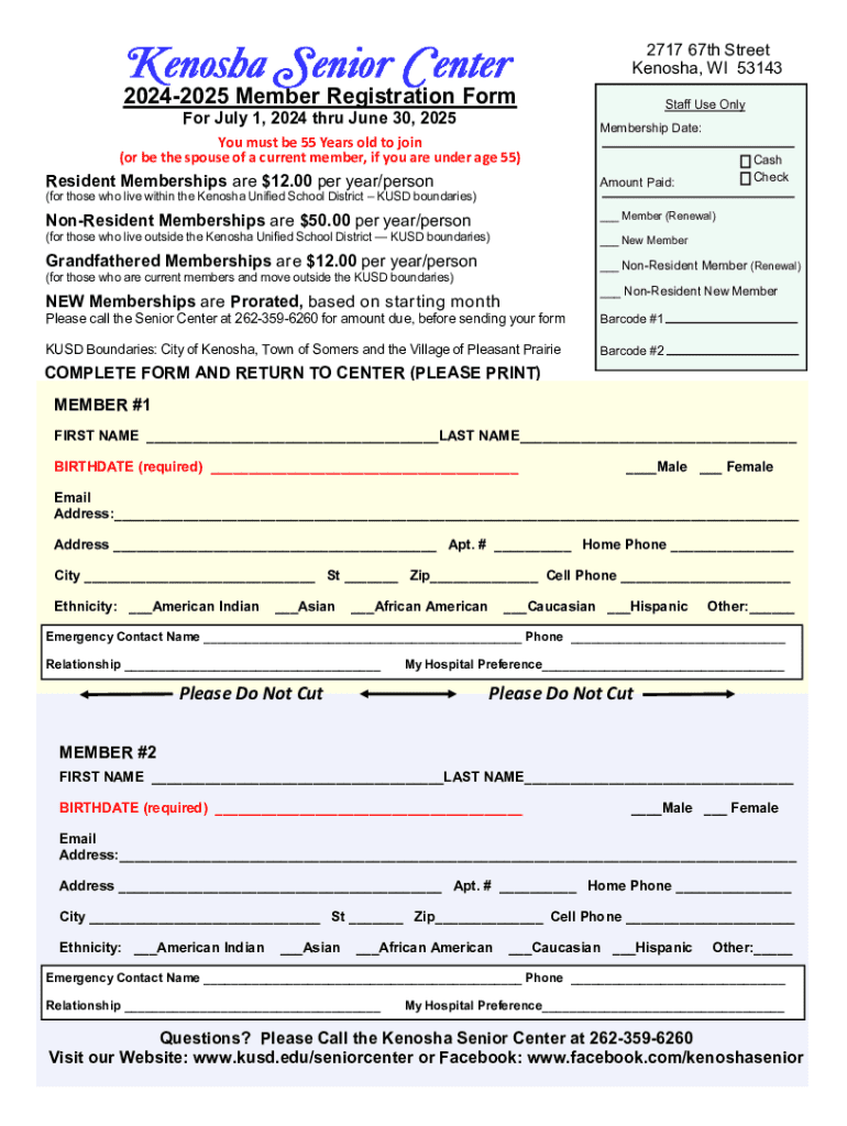 This form is for individuals aged 55 and older to register for membership at the Kenosha Senior Center for the duration of July 1, 2024 to June 30, 2025. It includes information for both resident and non-resident memberships, renewal options, and contact details.