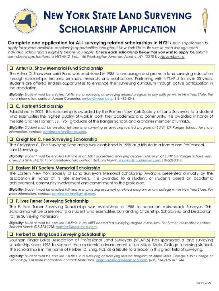 This application allows students to apply for multiple surveying-related scholarships available in New York State. It includes specific scholarship details, eligibility requirements, and submission information to support students in pursuing land surveying education.
