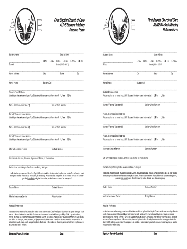 This release form is intended for students participating in the ALIVE Student Ministry at the First Baptist Church of Caro. It collects necessary information about students, their parents or guardians, and emergency contacts, while also obtaining permission for medical treatment and participation in youth activities.