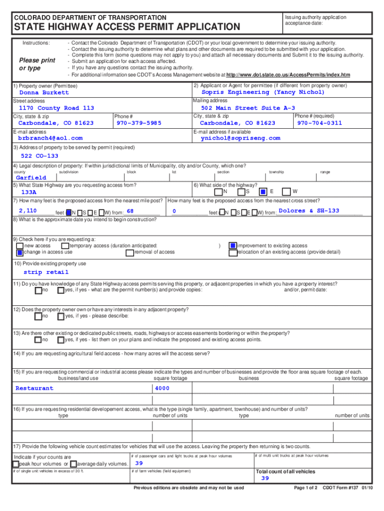This document is an application for a State Highway Access Permit from the Colorado Department of Transportation (CDOT). It outlines the permit provisions, requirements for construction access to state highways, permittee responsibilities, and procedural guidelines for compliance with state regulations regarding highway access and environmental standards.