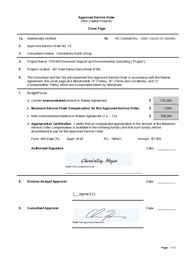 This document serves as an approved service order for environmental consulting and support services related to the FS8 Bid Document and Site demolition. It outlines project details, budget, tasks, and approvals necessary for the consultancy agreement with Cornerstone Earth Group, ensuring compliance with environmental regulations.
