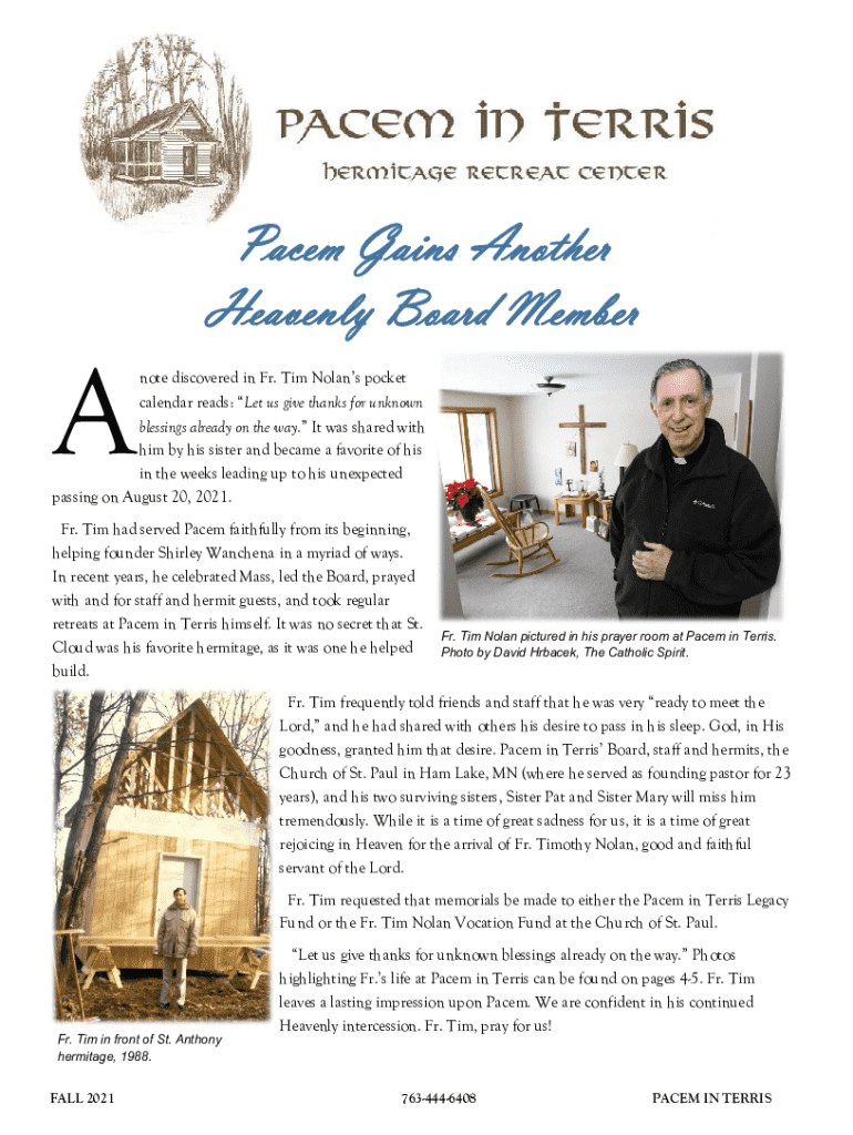 Pacem Gains Another Heavenly Board MemberAnote discovered in Fr. Tim Nolans pocket calendar reads: Let us give thanks for unknown blessings already on the way. It was shared with him by his sister