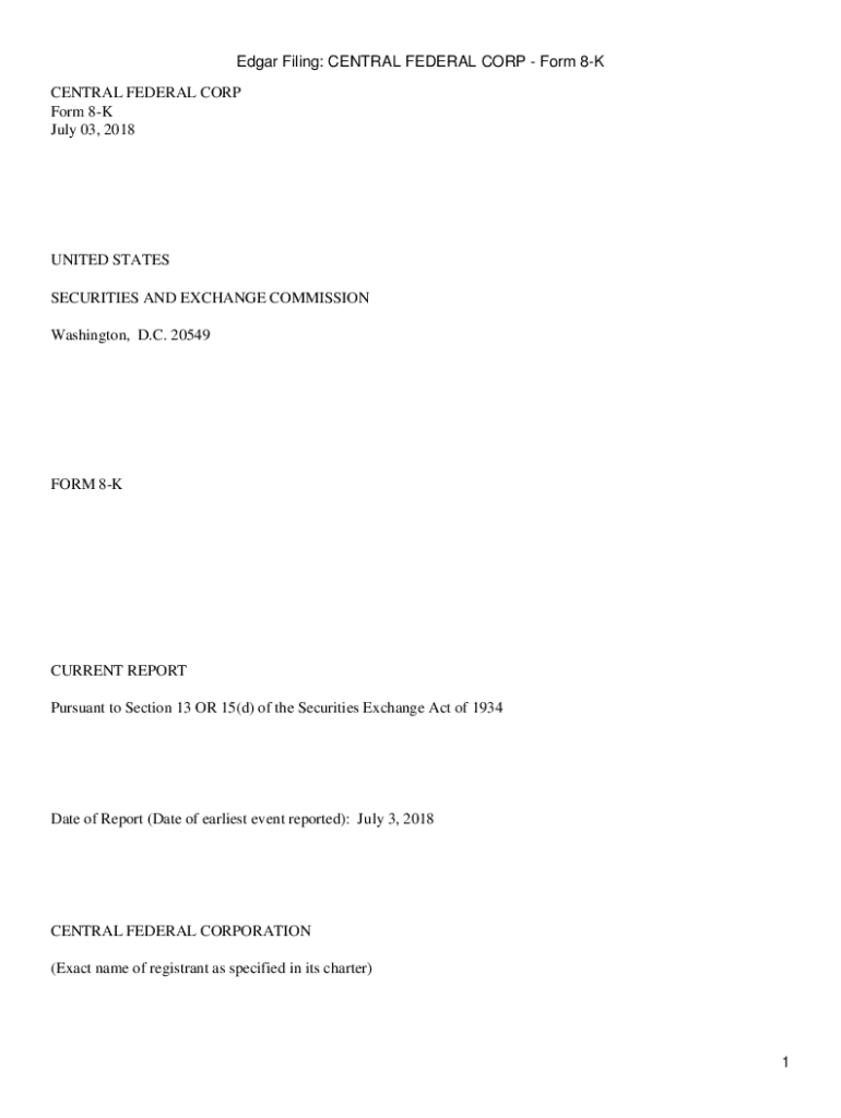 Edgar Filing: CENTRAL FEDERAL CORP Form 8K CENTRAL FEDERAL CORP Form 8K July 03, 2018 UNITED STATES SECURITIES AND EXCHANGE COMMISSION Washington, D.C. 20549 FORM 8K CURRENT REPORT Pursuant to Section