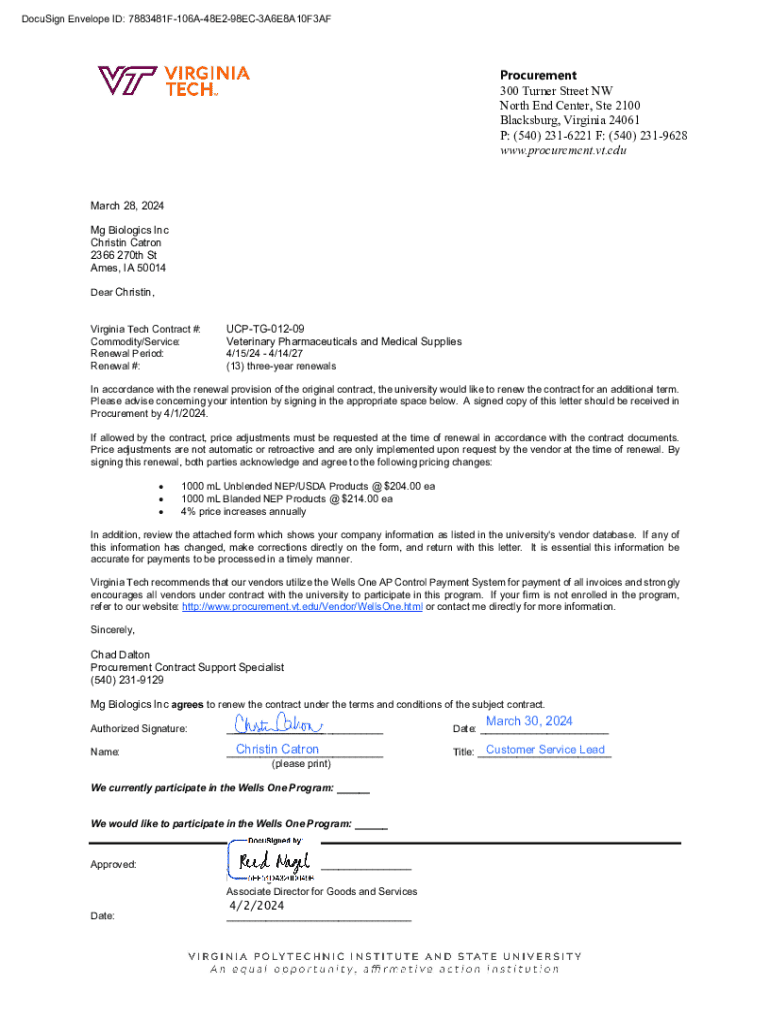 Procurement 300 Turner Street NW North End Center, Ste 2100 Blacksburg, Virginia 24061 P: (540) 2316221 F: (540) 2319628 www.procurement.vt.eduMarch 28, 2024 Mg Biologics Inc Christin Catron 2366