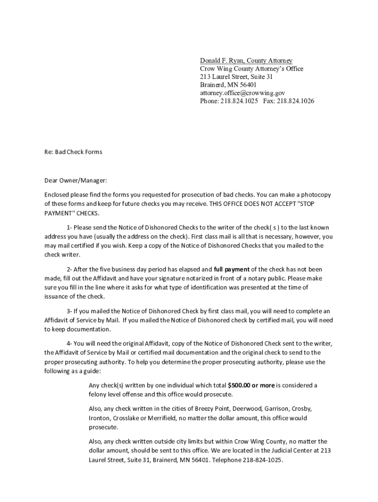 Donald F. Ryan, County Attorney Crow Wing County Attorneys Office 213 Laurel Street, Suite 31 Brainerd, MN 56401 attorney.office@crowwing.gov Phone: 218.824.1025 Fax: 218.824.1026Re: Bad Check FormsDear