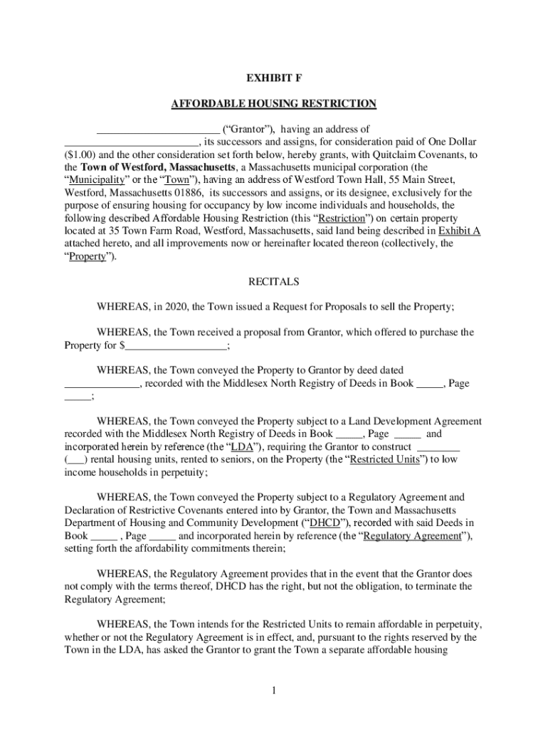 EXHIBIT F AFFORDABLE HOUSING RESTRICTION ___ (Grantor), having an address of ___, its successors and assigns, for consideration paid of One Dollar ($1.00) and the other consideration set forth below,