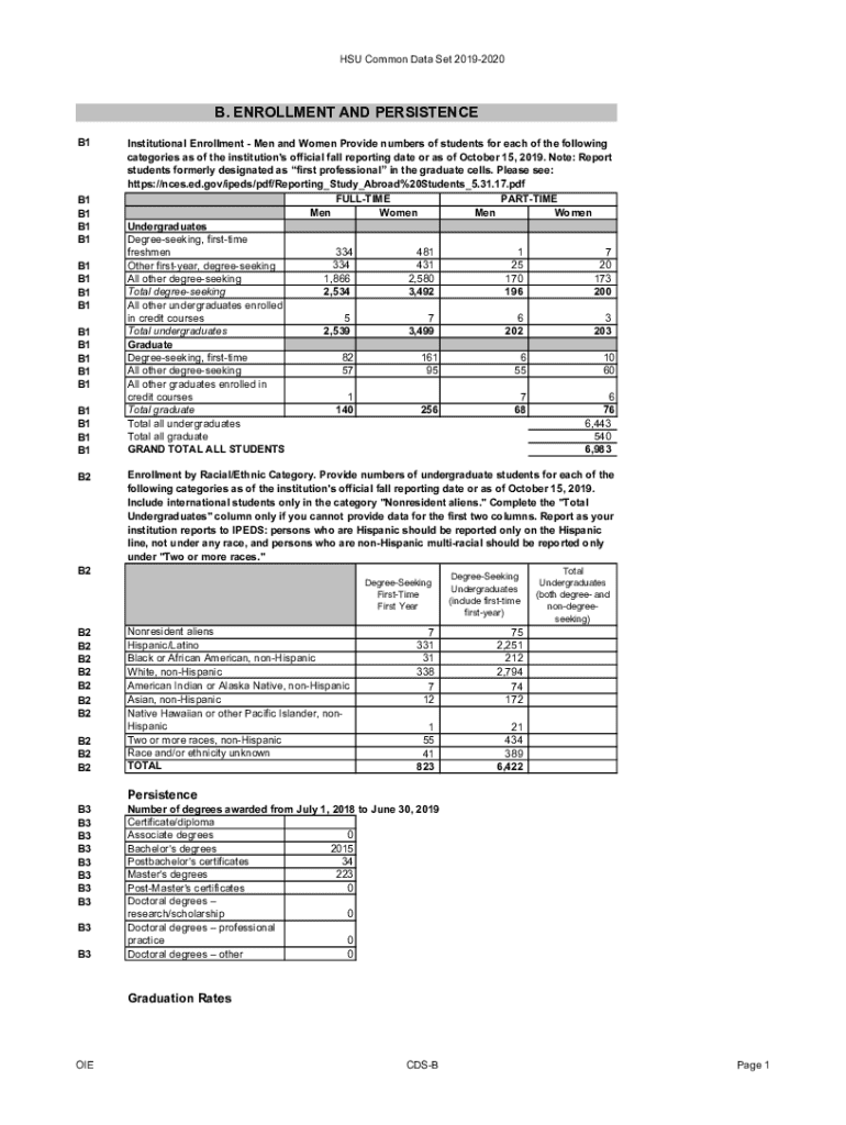 This document provides comprehensive data regarding enrollment, persistence, admissions, financial aid, instructional faculty, class sizes, and degrees conferred at HSU for the academic year 2019-2020. It includes detailed statistics on undergraduate and graduate enrollment, graduation rates, admissions processes, financial aid awarded, faculty demographics, and student life.