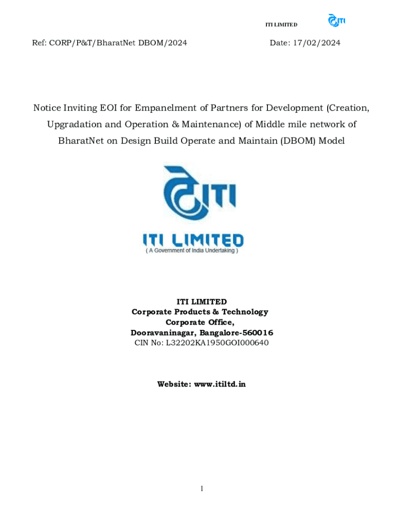 ITI LIMITEDRef: CORP/P&T/BharatNet DBOM/2024Date: 17/02/2024Notice Inviting EOI for Empanelment of Partners for Development (Creation, Upgradation and Operation & Maintenance) of Middle mile network