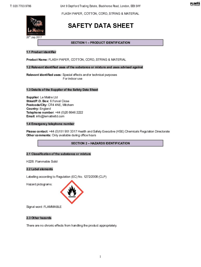 T: 020 7703 9786Unit 9 Deptford Trading Estate, Blackhorse Road, London, SE8 5HY FLASH PAPER, COTTON, CORD, STRING & MATERIALSAFETY DATA SHEET 25th July 2017SECTION 1 PRODUCT IDENTIFICATION 1.1 Product