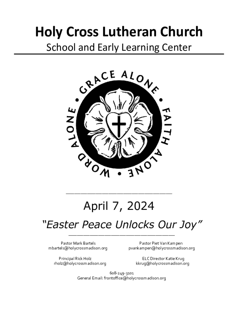 This document outlines the Easter worship service held at Holy Cross Lutheran Church on April 7, 2024, including details about the service structure, sermons, hymns, prayers, and community announcements. The theme \'Easter Peace Unlocks Our Joy\' emphasizes the joy of the resurrection through various readings and hymns, as well as practical information for attendees.