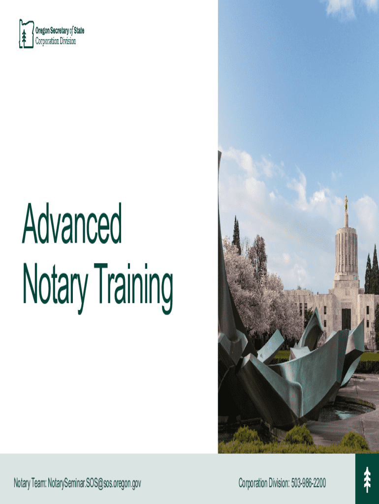 Advanced Notary TrainingNotary Team: NotarySeminar.SOS@sos.oregon.govCorporation Division: 5039862200Resources Forms https://sos.oregon.gov/business/Pages /notarypublicforms.aspx Change of name or